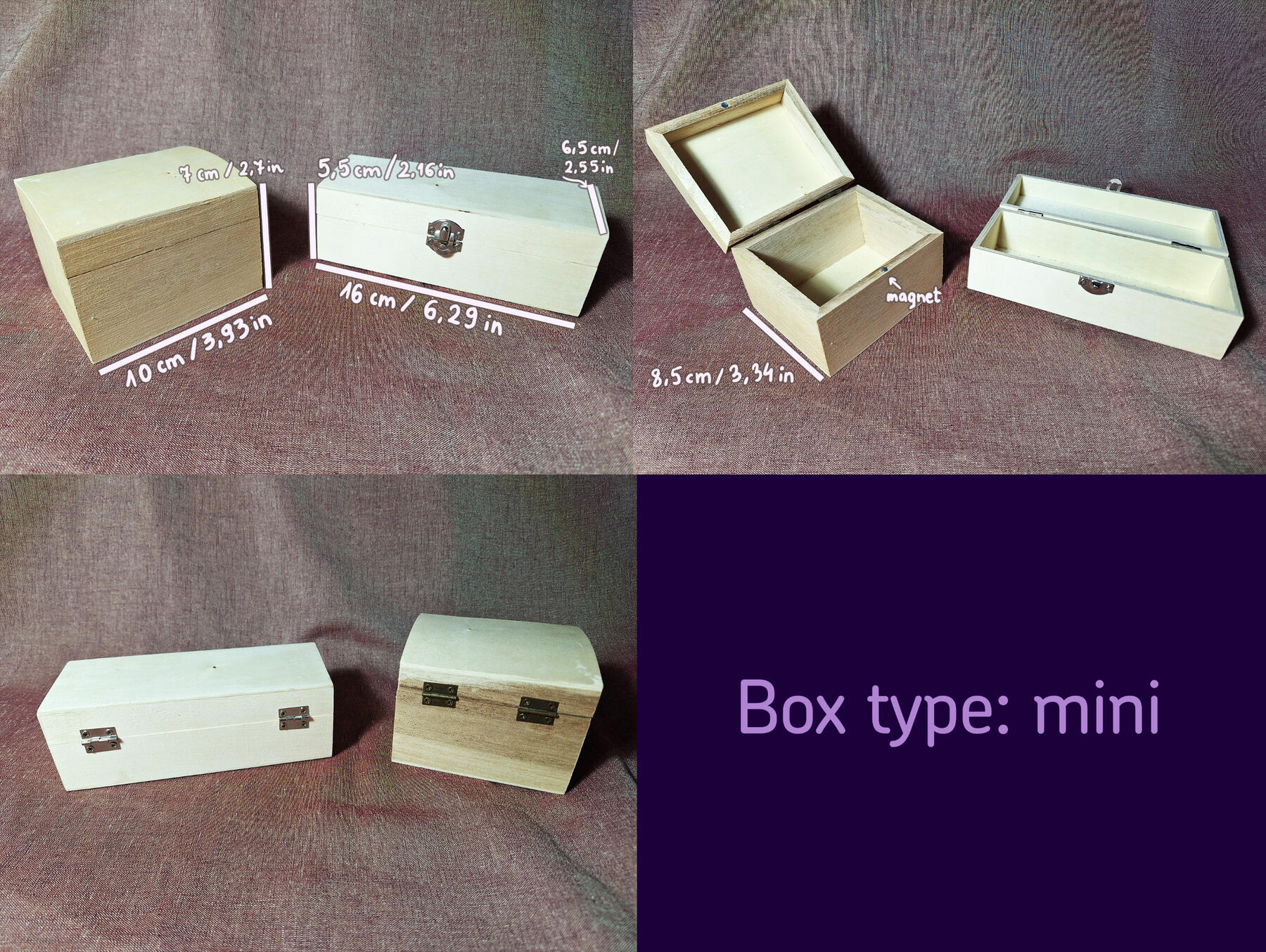 (Mini boxes are from a mass production, they are all that left from my previous stock, before finding a woodworking company to supply me)Prices: