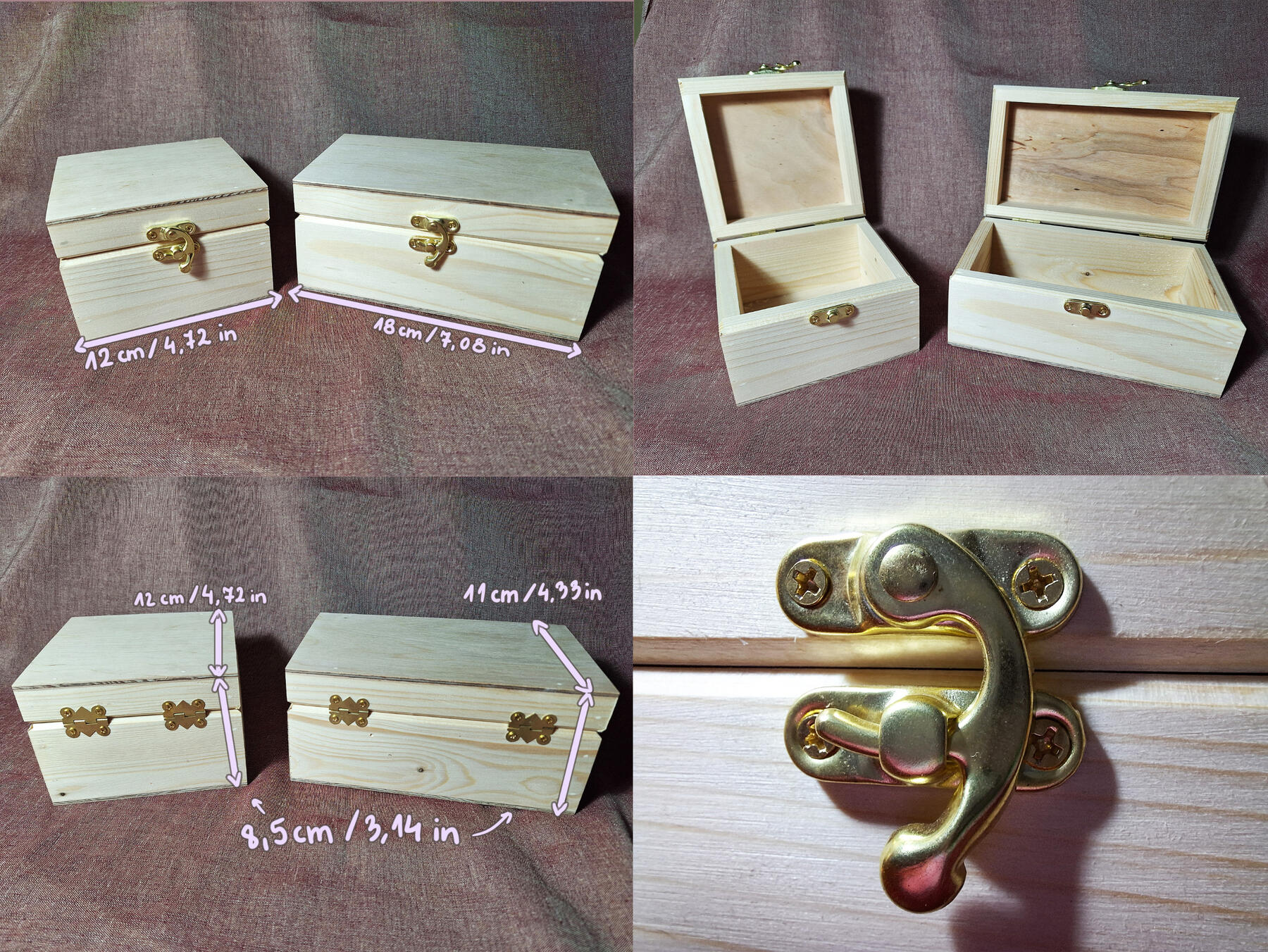 These boxes are a collaboration between myself and a talented small business. They use their expertise to craft each box from a pine wood, ensuring a lightweight yet sturdy design. The boxes also feature decorative metal elements that add a touch of elegance. Once I receive the handcrafted boxes, I take pride in personally polishing and decorating them by hand. This ensures each box is truly one-of-a-kind and reflects my unique style. Unlike mass-produced items, no laser cutting and burning is involved in the creation process, guaranteeing a personalized piece.Currently in stock: